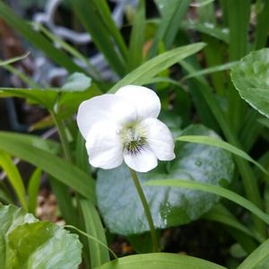 寄せ植えしていた丸葉スミレが今朝、一輪だけ緑の葉の中から顔を出してくれました🎶