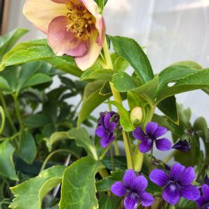 切り忘れのヘレボと勝手に同居のスミレが可愛くコラボ💕 ヘレボの花はカットしてスミレちゃんはどかしてあげないと可愛そうだよねー😅