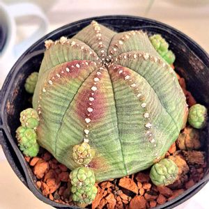 「ユーフォルビア オベサ 子吹きシンメトリカ」 子株が育ち鉢の縁に接触するようになったので 色々考えた末に鉢を小さくして植え替えました
