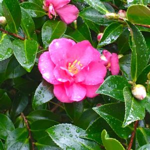 このピンクのサザンカもいっぱい花をつけていました。 童謡の「たき火」の歌詞にも登場します。「さざんか、さざんか 咲いた道...」冬の季語でもあります。 別名 イワハナビ(岩花火)ツバキ属