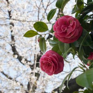 満開の桜をバックに大輪のサザンカ 名古屋今池の桜の名所,水道道へ行ってきました。まさに桜満開,そしてサザンカが植えられていてこれも美しい花を咲かせていました。これってすごくフォトジェニック。桜はむしろ引き立て役?笑)