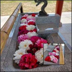 ボタンの開花は、少しだけでしたが、花手水が、綺麗でした🩷🤍❤