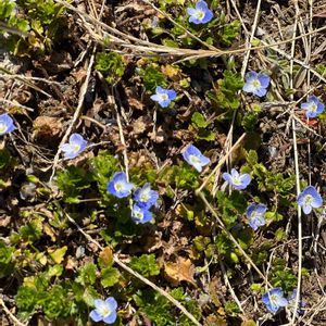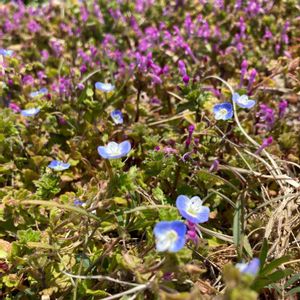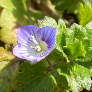 【オオイヌノフグリ】 おはようございます🙂 今日は散歩中に見つけた植物から『オオイヌノフグリ💠』を、ご紹介します。 オオバコ科クワガタソウ属の植物🌿で、ヨーロッパ🌍を原産とする雑草🌱の一種になります😌 春🌸を告げる野草として、レンゲソウ💗🌿やスミレ💜🌿と同じ今の時期に日本各地🗾の道端・林道・畑などで見られます。 青💙と白🤍の花姿をしていて、周囲に大きく広がってたくさん咲いているのが特徴的ですね😊 あと、稀に白一色🤍🌿の花色をしている個体もあるそうですよ🤗💕 (見つけたら、超ラッキー✨でしょうね🎶) 元々ヨーロッパ🌍などでは【ベロニカ・ペルシカ】と言う名前ですが、日本🗾では近縁種🌱の『イヌノフグリ』に似ていて少し大きめの花💠を咲かせる事から「オオイヌノフグリ」と呼ばれる様になりました☝️😉 残念な名前の植物🌿の1つとして有名ですが…💧一応、別名もありまして「瑠璃唐草(ルリカラクサ)」という名前があります☺️ コバルトブルー💙✨の花色をしている事から名付けられたみたいです。 あと、一番定着しつつある名前が【💠星の瞳💠】だそうです🤭(何だか、人の名前っぽく感じますね❣️) せっかく可愛らしい花💠🌿なので、早く植物学界🥸✨の人たちに正式に改名をしてもらいたいですね。
