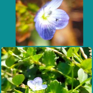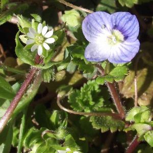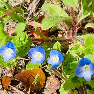 3/16㈫① 星の瞳(オオイヌノフグリ)と コハコベ こどもの国つばきの森のビニールハウス手前辺りに咲いていました。 🏷(祝)チーム・ブルー1周年 ( )と1は半角です