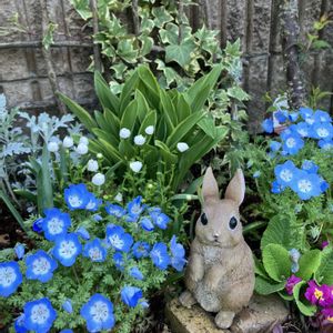 うさぎちゃんコーナーです🐇 少し薄い水色のネモフィラと ノースポールなどなどで、モリモリです☺️