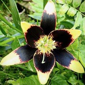 AH百合のフォーエバースーザンです😊濃いオレンジ色に黒に近い褐色の二色咲が強烈なインパクトですねー💕😍🖤😍🧡どこかのサイトで、昭和レトロな感じも・・と書かれていましたが、ワタシはどちらかというとモダン(死語かも~実にこの言葉こそ昭和レトロなのね^^;)な印象を持ったのはσ(^▽^;)も昭和の人間なので、あら素敵と思ったのかしら―ヾ(≧∇≦)ノ