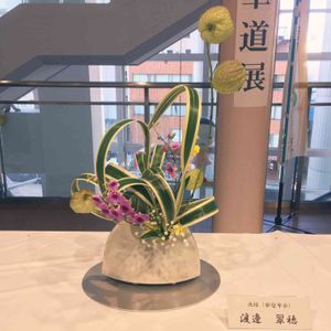 先生がまたむずかしそうな花器を持ってきてくださって、吸水スポンジをカットして詰めるところからやらせてくださいました。 小さな穴の吸水スポンジの中で、枝どうしが邪魔しあわないように、無事に全部刺さるようにするのが第一目標です… 帰りはハンドルを持って運転するみたいに持ち帰りましたよ(^o^) (葉っぱ一枚どっかに落としてきちゃった)