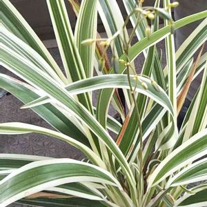 斑入りキキョウラン•*¨*•.¸¸☆*・゚ オリヅルランに似てるけど 葉っぱが太く大きいです☺️ 草丈が1m位になり花後は青い実が出来るそうです💙 これは鉢植えですが地植えのはもっと大きくなってます😆💕