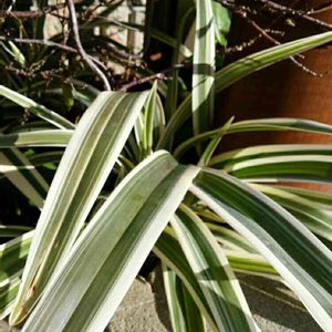 斑入キキョウラン Dianella ensifolia(?) どこかの道の駅で葉の美しさに惹かれて購入。植え付けてから初めての冬ですが、寒さにも負けずどんどん伸びています(^-^)