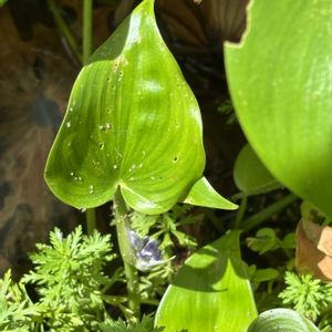 ミズアオイ(水葵) *ミズアオイ科ミズアオイ属 花期は8〜10月 北海道〜九州の水田.池沼などの湿地帯に生育する抽水植物の一年草! 高さは30〜70cm 葉は質が厚く光沢があり心形で全縁! 花は1日花で葉より高い位置に総状花序を出す!(似たコナギは花序が葉の下) 青紫色で花被片6個! ・抽水植物 根は水底の土壌中にあり葉や茎が 水面から出ている植物 ここは去年見た沼ですが、去年の大群落は6月の大雨で株が流されてその後、タニシの被害でほとんどが消えたそうです! ですが近くの別の池に新たに群落が現れました。 作業中の方に植栽かと尋ねてみると、自生だそうです! 生き延びるための植物達の意思のようなものを感じて驚きました❗️ 9月4日撮影 宮城県 登米市