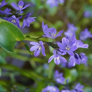 【水葵】《ミズアオイ科》 花言葉 「前途洋々」 別名(古名) ナギ(菜葱・水葱) ミズアオイはナギ(菜葱・水葱)とも呼ばれる植物です。 ミズアオイの若い芽や葉を塩ゆでにし、食用としたところからナギ(菜葱)という名前がついたと言われます。 また、九州地方ではミズアオイの葉や茎を煎じ、胃潰瘍の薬として用いられていたこともありました。 ミズアオイの青紫の花は染物に使われていたこともあり、かつては、そこかしこに咲き乱れる花だったことがうかがえます。 芽生えたばかりのミズアオイの葉は、笹のように細く尖った形をしていますが、成長するにつれ光沢のあるハート型のかたちになります。 ミズアオイの名は、葉がフタバアオイの葉のかたちに似ているところから、水辺のアオイ「ミズアオイ」と呼ばれるようになりました。 花の大きさはおよそ3センチ。花びらが6枚あり、中心には1本の雌しべに対し6本の雄しべがあります。6本の雄しべのうち5本は黄色く、残りの1本は濃い紫色をしているのが特徴です。 絶滅危惧種ではありますが、種の生命力は強く、何十年と休眠していても生育環境が整えば発芽する植物です。
