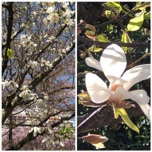 おはようございます😊 今日のお花 💠コブシ 💠 ①②③ 今年も咲き始めましたが昨年のpicです🙏 ④⑤先に咲き始めたハクモクレンの痛ましい花姿(犯人は🐦⬛?) 5枚あります♡♡♡ 見てくださいね😊🎶💕︎ 職場にコブシとモクレンが同時期に咲くので違いを(๑╹o╹)φメモメモ 樹高5~15mのコブシの花弁は6枚で上や横向きに大きく開いて咲き付根に葉っぱが1枚付く🌿 樹高 1~5mのハクモクレンの花弁は9枚が閉じ気味に咲き葉っぱはない❁⃘*.゚