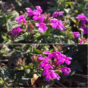 〓早朝の投稿便🚚〓 <散歩道で👀‼️> 道端に咲くビジョザクラ(美女桜) 和名は花の形が桜の花びらに似て、花の美しさを美女に例えたというのだが😂🤭 バーベナの名前で流通。 バーベナは約250種あるクマツヅラ科クマツヅラ属の総称。 花の色は白、赤、ピンク、紫、青紫、紅紫など様々。 テマリバナ(手毬花)とも呼ばれるらしいです😅