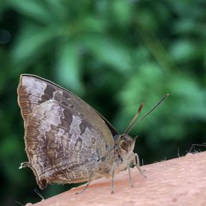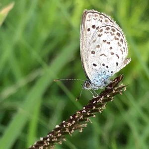 小雨の中、傘をさしながら雑草を見ていると小さな蝶がヒラヒラと飛んで来て、右手の甲に止まりました しばらく見ていましたが飛び立つ気配がありません 雨宿りをしているようです そっと右手のスマホを左手に持ち直し、不便な左手だけでカメラを起動して撮りました 一枚目は背景が地面のアスファルトになって全然ダメ写真 ならばと左手だけで不器用にズームして、背景に緑の濃淡が来るように右手をひねり何枚か撮った 近くのアジサイの葉に移そうとしても移ってくれない 手を高く上げてフッと吹くと飛んで行った 今度は大きな葉の裏に隠れるんだよ… 蝶好きな人間がわかったのか、シミだらけの手が枯葉に見えたのか🍂 ムラサキツバメさん、どっち?…