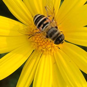 ハナアブの仲間 いつも上から撮るだけですが ジッとしてくれないので なかなかいい角度で撮らせてくれない 少し前から撮りたいんですけどね