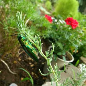 朝、外に出ると何やら綺麗な虫がいた。 調べてみたらヤマトタマムシという虫で、別名、吉丁虫。 昔からこの虫をみかけると、恋愛運、金運があり縁起が良いものとされているらしい。 皆さんも幸せになりますように🙏 その後、子守りを頼まれて家に来ていた孫が、石を投げてしまい、何処かへ飛んでってしまった。 私の幸せ帰って来て〰😢