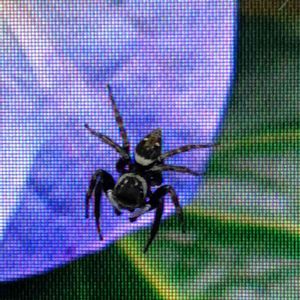 花と虫 アジサイの花にハエトリグモ よく見ると網戸に乗っているように見えますが・・・ 実は液晶ディスプレイ windowsの壁紙です マウスを動かすと追いかけてくるようになるらしいのですが、まだそれほど仲良しではありません
