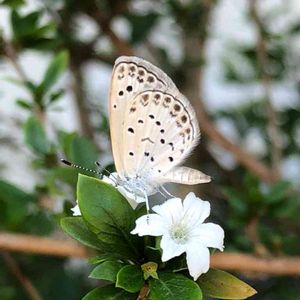 ヤマトシジミとツゲの花 今日も朝からものすごく暑く、生まれたばかりの小さいチョウにとってはいきなりの試練ですね