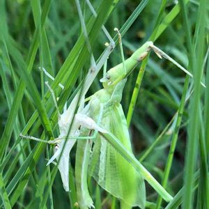 バッタの親子かと思って撮ったら 左側の白いのは脱皮した抜け殻でした 朝の公園は時々珍しいものが見られますね