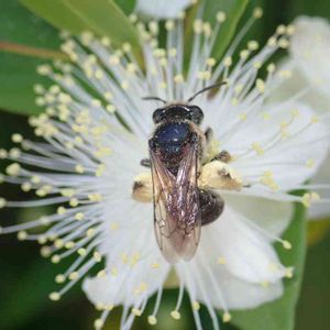 花と虫 花:ギンバイカ 虫:ハチの仲間 足に花粉をたっぷりためている 雄蕊が多いので沢山集められる