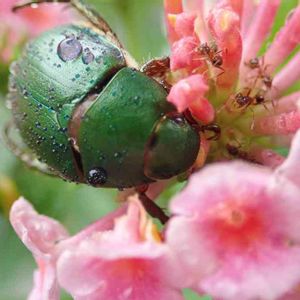 花と虫 花:ランタナ 虫:コガネムシとアリ 雨宿りしているコガネムシをアリが襲っているようにも見える