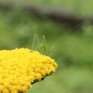 雨の日の散歩の一枚です。 ツユムシでしょうか?花に踏ん張ってました。花の名前がわかりません。ご存知の方教えてください🙏