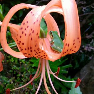 おはようさん(*´∀`*)ノ いつもの光景─♡ お客様は、蛙🐸君! アジサイも引き立つ。