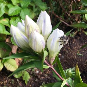 白リンドウとハイイロマルハナバチさん🐝 閉じてる花をこじ開けて中に入っていきました😳🙌 器用だなぁ😆 このリンドウとても綺麗です🤍 母に株分けしてもらいましたが、品種不明😅