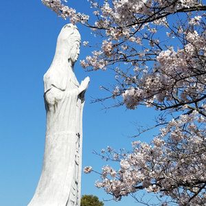 桜と平和観音 カテンソウの咲く山の高さは 140㍍程。歩いて20分です🚶♀️ 山頂に立つ観音像。 戦争中の空襲で亡くなられた 市民の慰霊の為に建てられたそうです。 市街地に向かって 立っている観音様と一緒に 私も平和を 祈りたいと思います🤲