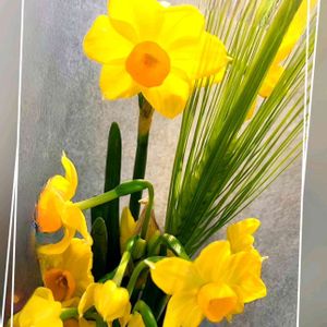 おはようございます🙋♀️ 🏷️月曜に ビタミンカラー 🏷️春の訪れ 🏷️黄色い花♡ ラッパ水仙と麦の緑が春を告げてます♪︎♪︎♡