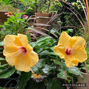こんにちは☀️🌱 今日はついにハイビスカス🌺が 一度に6輪咲きました~\(^0^)/ そういえば、ピンクはかなり久しぶりですネ 7月15日に投稿してから ずっとご無沙汰していました😅 しかもpicを撮ったのが朝だったからか レモンイエローは いつものように 遅れて咲くみたい♬︎♡ ちょっと見にくいですが 今日はハイビスカスに全員集合してもらいました٩( ᐛ )و