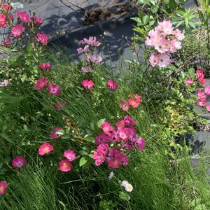 🔥30℃の今日の庭作業はキツい😱松の芽摘み終了💪明日はツツジ刈るぞ🫨赤い薔薇に赤い立葵🔥 ①🌹ゲーテローズ ②紫陽花マジカルハイドランジア色付き始めた ③種まきタチアオイ2年めで開花✨赤だった❣️ ④アスチルベ赤は未だ ⑤マツ🌲後は秋に庭師さんに直してもらおう