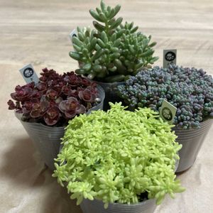 セダム4種盛り 今週は雨続きと思っていたけど 朝から貴重な太陽が‼︎☀️ 多肉&サボテンに水分補給🚿 写真はこの前寄せたセダム4種🍀 (細葉黄金万年草、オカタイトゴメ、 リトルミッシー、パリダム)