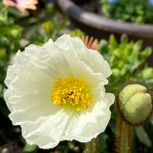 今晩は☺ 以前upしたデカポピーちゃん 大きさがよく分かんな〜いということで、 雫ブランドの🕶ピータン(うずらの卵くらい?)を比較対象にしてみました🤣 隣はこれから大きく育って咲く予定の蕾 けっこう毛深い…🍑😆 お花は、rinrinちゃんとこのポピー「尻太郎」にそっくり👀 なので私も尻太郎ちゃんと呼ばせていただきます🤣 ⬇️シラユキゲシも咲きました❣ 別名 スノーポピー ポピーちゃんと同じケシ科なので、よく似てる🌼✨ 雪のように美しい白い花 繁殖力が強いそうなので、地に下ろさず鉢で育ててます