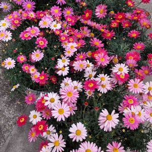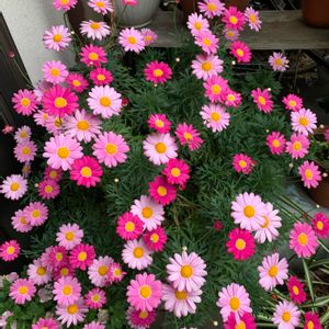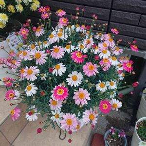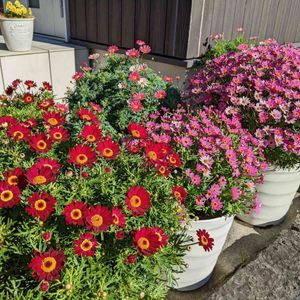 我が家のマーガレットゾーン、ここだけ見ると春みたいに賑やかに😊💕いつもボンザマーガレットのローズピンクばかりですが他のマーガレット達も徐々に咲いてきました🥰