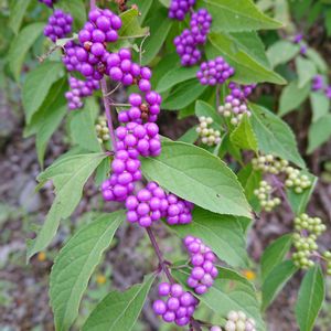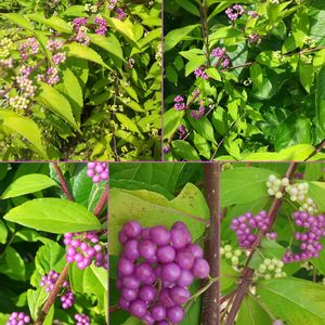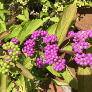 9/4 (日) 🌤 🌿💜コムラサキ💜🌿 学名❀✿Callicarpa dichotoma 英名❀✿Purple Beautyberry 別名❀✿コシキブ、ミムラサキ ※クマツヅラ科(シソ科) ※ムラサキシキブ属 ♣️コムラサキは、日本各地の林などに生息する自生種「ムラサキシキブ(紫式部)」の園芸品種で、別名「コシキブ(小式部)」ともいう。上品な実の紫色から「源氏物語」の作者にちなんで付けられた、とても雅な名前。 ムラサキシキブは、背丈が3m以上になり、枝がたれ下がらない。コムラサキは背丈が1.5mほどにしかならず、枝がたれ下がる。♣️ 9/3付、公園広場にて📸📱🌿大分、色付いてきました💜💜💜