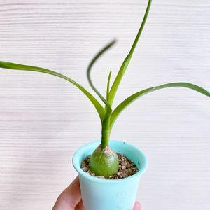 玉ねぎみたーい! って言ってたら貰った球根のような植物 黄色い鉢に一緒に入れてたら芽が出たよ とりあえず緑部分が水につかないように水耕栽培 調べたところ、コモチカイソウ、もしくはカウダツム??