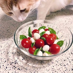 今日の夕食になったバジルです トマト モッツァレラチーズ と一緒に オリーブオイル 塩 胡椒をかけて出来上がり ノルウェージャン フォレスト キャットの林太郎(りんたろう)はチーズが大好きです