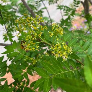 山椒 鳥が運んでくれて育った山椒の木も、年々大きくなり、剪定するほどになりました🌿 今年初めて花が咲いたので、実もなるのかな💓と期待したくなりますが、それはまだでしょうか☺️ 蜂がブンブン飛んでました🐝 ピリッと甘いのかな😘 山椒の葉は今しか採れないので、冷凍保存の分まで一杯採らないと!👩🌾 大根の葉やちりめんなどと合わせて作る佃煮が、とーっても美味しいんですよ🌿🥳