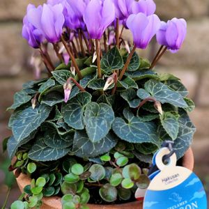 小さな寄せ植え 🏷️2025秋の十草 シクラメン シクラメンドラゴン❁💜 何とも情緒あるお色 不思議な事に 💜色合いの洋服も小物も 持っていない私だけど お花は、別なんだね~ 心惹かれる紫💜❁🤭☺️😍 真ん丸こい葉が可愛らしくて まず手にとり 似合うお花を探して 店内ウロウロ彷徨って……… で、シクラメンドラゴンに。