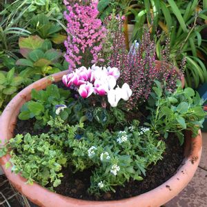 多肉さんを置いてた場所が寂しくなったので寄せ植えをしてみました🎶 クリスマス🎄っぽくしようとしたんですが😅 ちょっとイマイチ🤔 エリカ属オーテシーとガーデンシクラメン💕