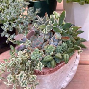 *寄せ植えです🌱 天高く晴れて☀️31℃ 久〜しぶりの青空ですョ🤍 多肉さんたちもお日様を浴びて元気になりそう🌱 ただ紫外線が強くてビックリしたのは私です(=^x^=) 今日の🪴植木鉢はhiroさんの作品です♡