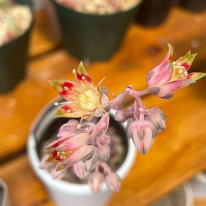 曇り時々☀️気温21℃、時々のぞく太陽がジリッと暑いです(^ー^; )"~ お花が咲いているのはルスビー× ヒアリナ🌱です。 お花を撮ると多肉さんが遠くて映らないですョ(〃ω〃) *多肉さんの花の茎が長く伸びるのは蜂にここだよ〜と見つけてもらう為だと羽兼さんが仰っていました(YouTubeより) 🌱