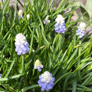 ムスカリさんなんだけど…… タグ紛失で品種名が分からないのですが… 頭の上が水色のムスカリさん、スマートに咲くムスカリです🎶