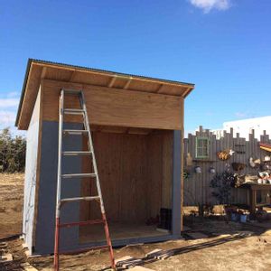 いい青空だけど強風すぎて周りが畑の我が家には本当困りもの。゚゚(´□`。)°゚。 小屋は大体形になってきたかな〜 汚庭ですが…たまには引きで(´-ω-`)
