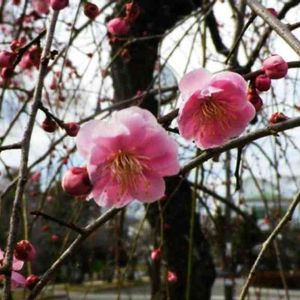 梅一輪 散歩道(京都丹波亀岡 南郷公園)の枝垂れ梅の一番花が咲きました。