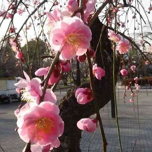 南郷公園の枝垂れ梅 散歩道の枝垂れ梅の開花です。 チラホラ咲きだしました。