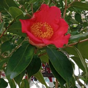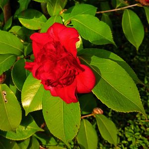 大輪ツバキ 散歩道(京都丹波亀岡 南郷公園)に咲いていた。 大輪(花径150mm)の赤いツバキが咲いていました。