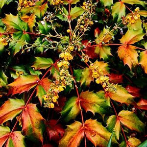 散歩道(京都丹波亀岡 南郷公園)のヒイラギナンテン 散歩道のヒイラギナンテンに花が付いていました。