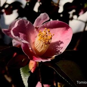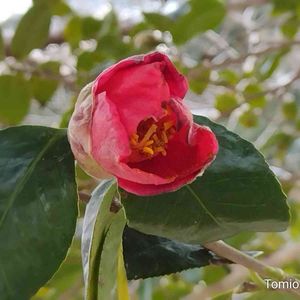 ヤブツバキ 散歩道(京都丹波亀岡 南郷公園)のヤブツバキが咲き始めました。 まだ、一輪のみの開花ですが、これから次々と、、、